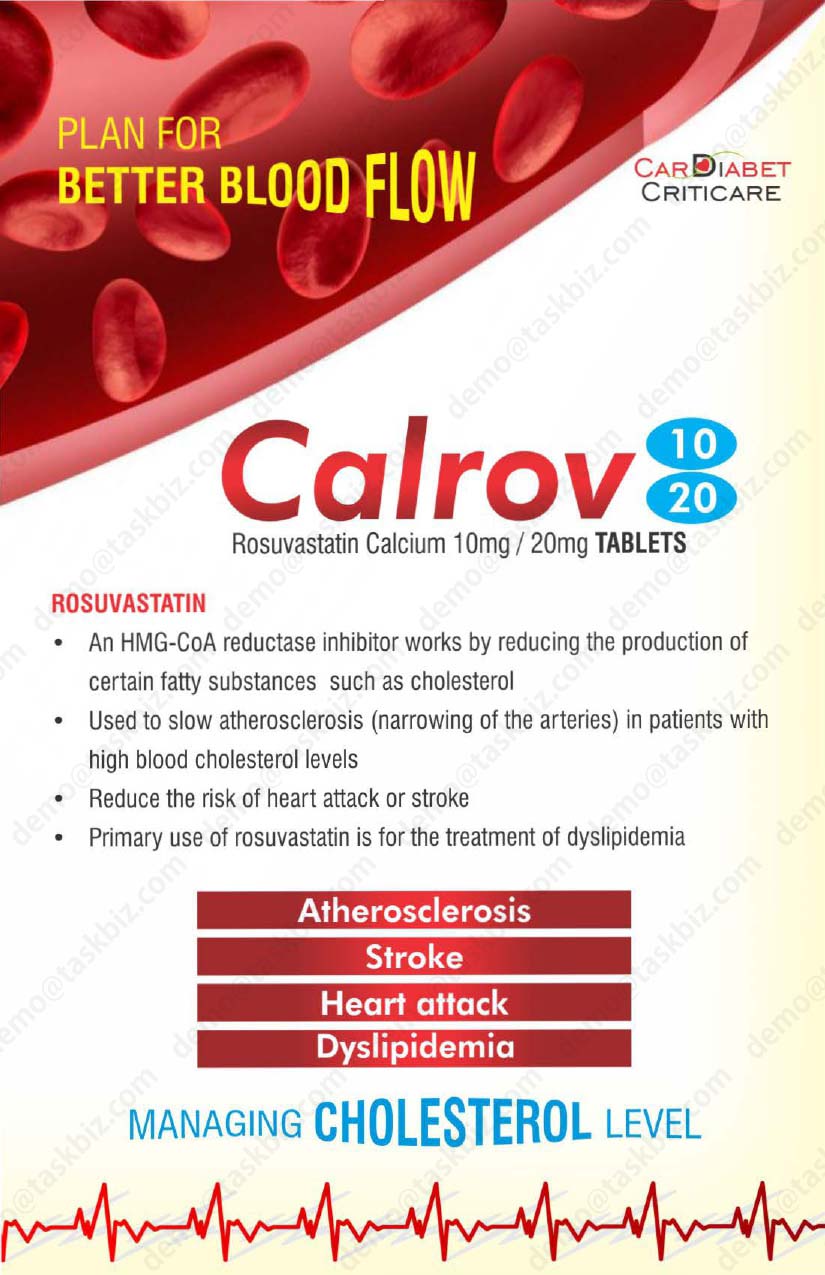 CARDIAC RANGE 9 CALROV-10 CALROV-10 Rosuvastatin Calcium10mg1. 54% relative risk reduction in myocardial infarction.2. 48% relative risk reduction in stroke.3. 47% relative risk reduction in revascularization procedures. ALU-ALU Website Link Product Image Visual Image