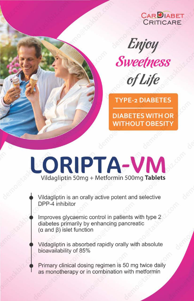 DIABETIC RANGE 2 LORIPTA-VM LORIPTA-VM Vidagliptin 50mg + Metformin 500 mgIt is used to treat type 2 diabetes mellitus in people who are already taking vildagliptin and metformin tablets separately, or whose diabetes cannot be controlled by metformin alone Type 2 diabetesmellitus used to be known as 'non-insulin- dependent diabetes mellitus (NIDDM)' or 'maturityonset diabetes BLISTER(BI-LAYERED) Website Link Product Image Visual Image