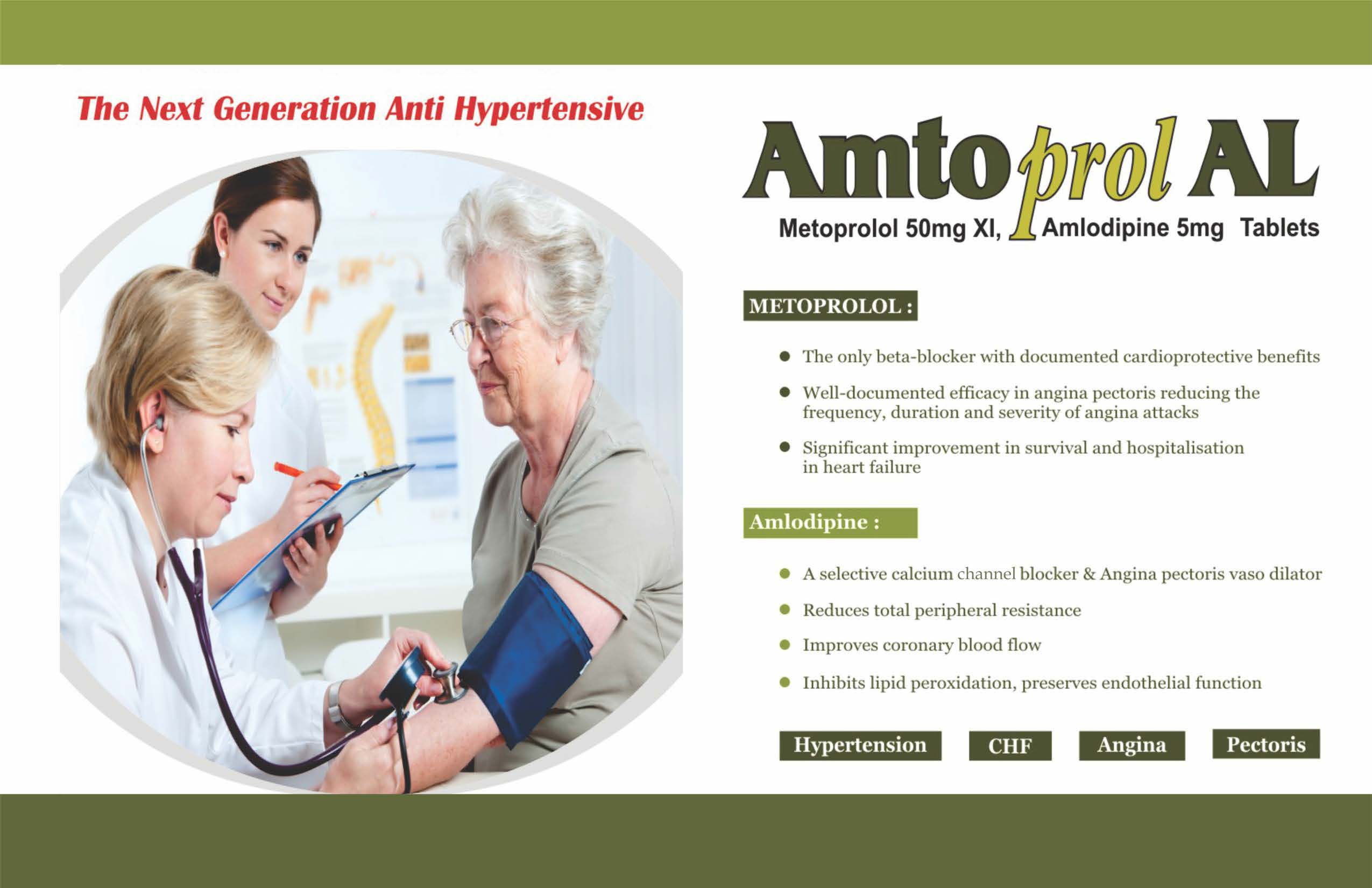 CARDIAC RANGE 10 AMTOPROL-AL AMTOPROL-AL Metoprolol 50mg XL + Amlodipine 5mg1. well documented efficacy in angina pectoris reducing the frequency, duration & severity of angina attacks.2. A selective calcium channel blocker vaso dilator.3. Reduces total peripheral resistance. BLISTER Website Link Product Image Visual Image