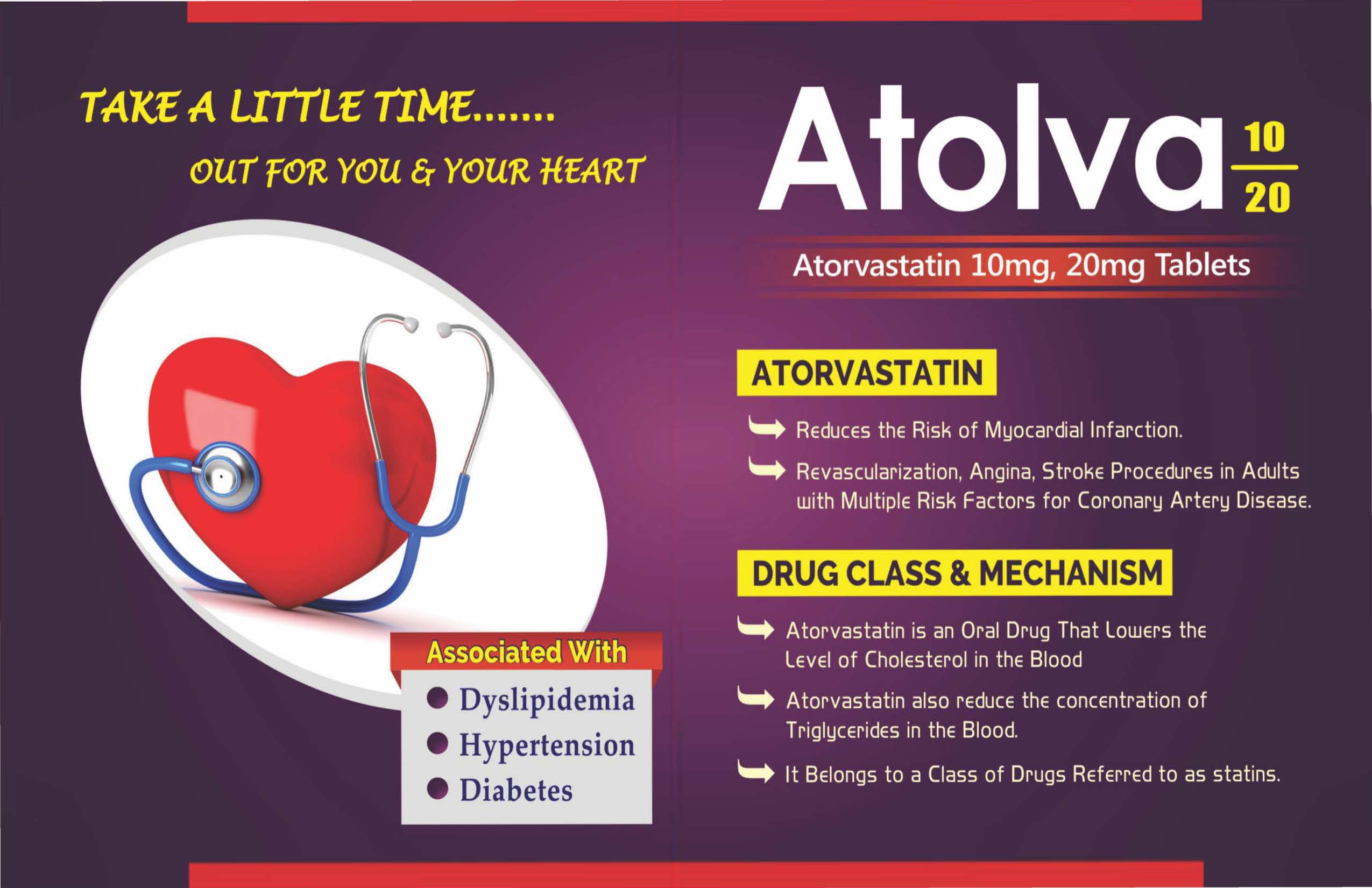 CARDIAC RANGE 13 ATOLVA-20 ATOLVA-20 Atorvastatin 20 mg1. Resuces the risk of myocardial infarction.2. Atorvastatin is an oral drug that lowers the level of cholesterol in the blood.3. Atorvastatin also reduces the concentration oftriglycerides in the blood. ALU-ALU Website Link Product Image Visual Image
