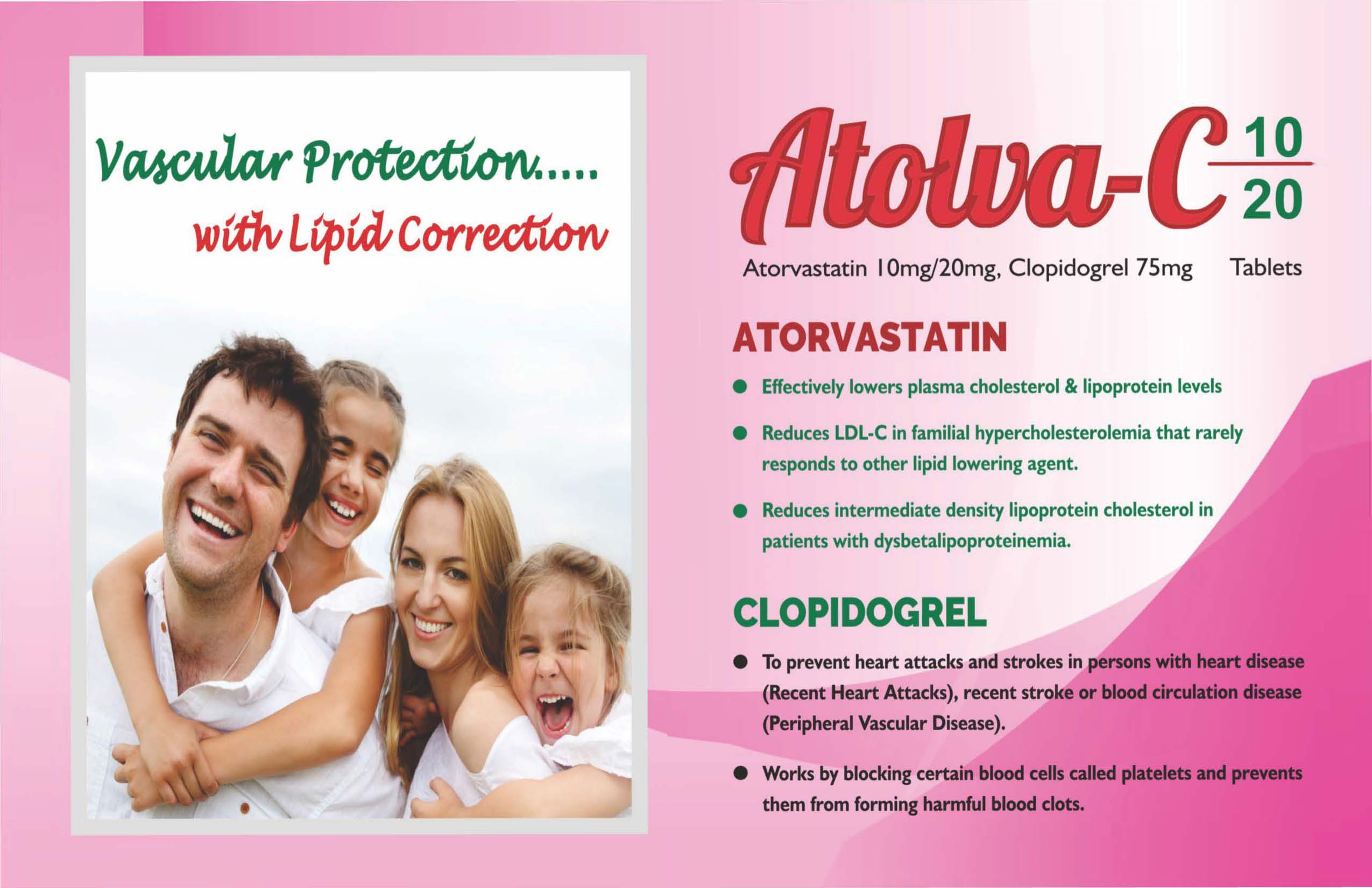 CARDIAC RANGE 12 ATOLVA-C10 ATOLVA-C10 Atorvastatin 10 mg + Clopidogrel 75 mg 1.Effectively lowers plasma cholesterol & lipoprotein levels.2. To prevent heart attacks & strokes in persons with heart disease (recent heart attack), recent stroke,or blood circulation disease (peripheralvascular disease. ALU-ALU Website Link Product Image Visual Image