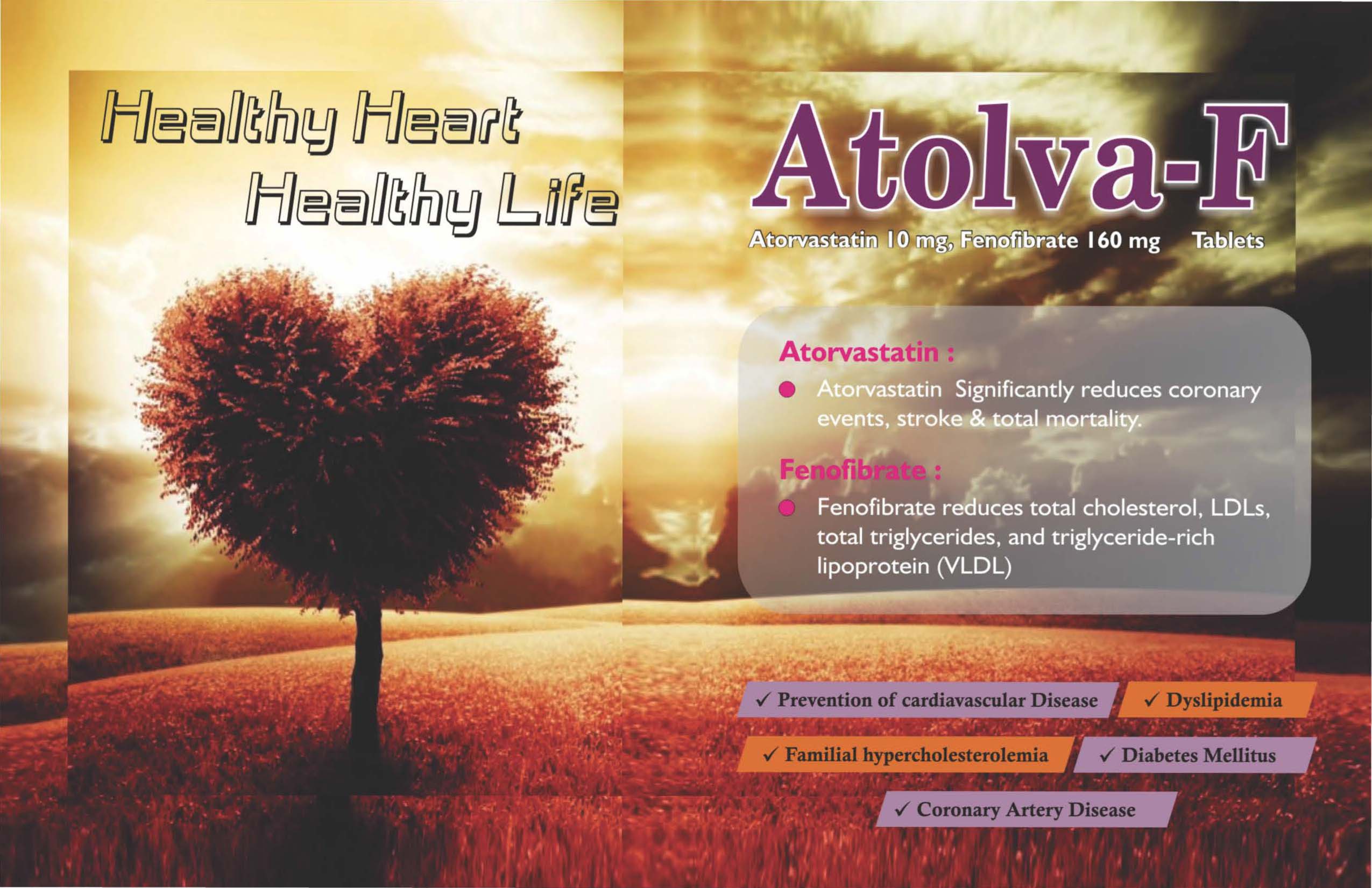 CARDIAC RANGE 11 ATOLVA-F ATOLVA-F Atorvastatin 10mg + Fenofibrate 160mg 1. Atorvastatin is used along with a proper diet to help lower "bad" cholesterol and fats (such as LDL, triglycerides) and raise "good" cholesterol (HDL) in the blood. 2. Fenofibrate helps reduce cholesterol and triglycerides (fatty acids) in the blood. 3. High levels of these types of fat in the blood are associated with an increased risk of atherosclerosis (clogged arteries). 10x10 TAB. Website Link Product Image Visual Image