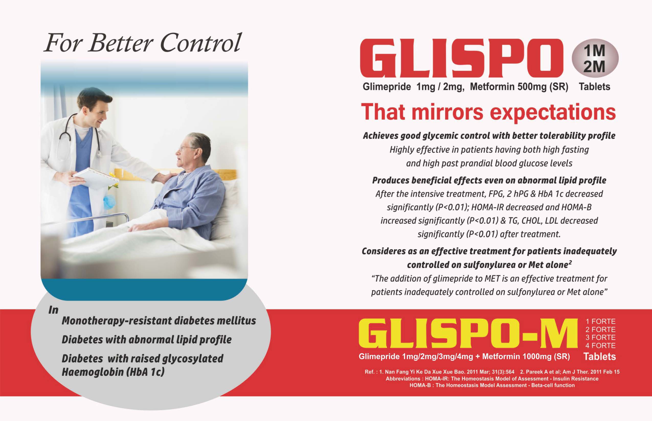 DIABETIC RANGE 11 GLISPO-1M GLISPO-1M Glimepride 1mg + Metformin 500mg (SR)1. Highly effective in patients having both high fasting and high post-prandial blood glucose levels.2. The addition of glimepiride to MET is an effective treatment for patients inadequately controlled on sulfonylurea or Met alone. BLISTER (BI- LAYERED) Website Link Product Image Visual Image