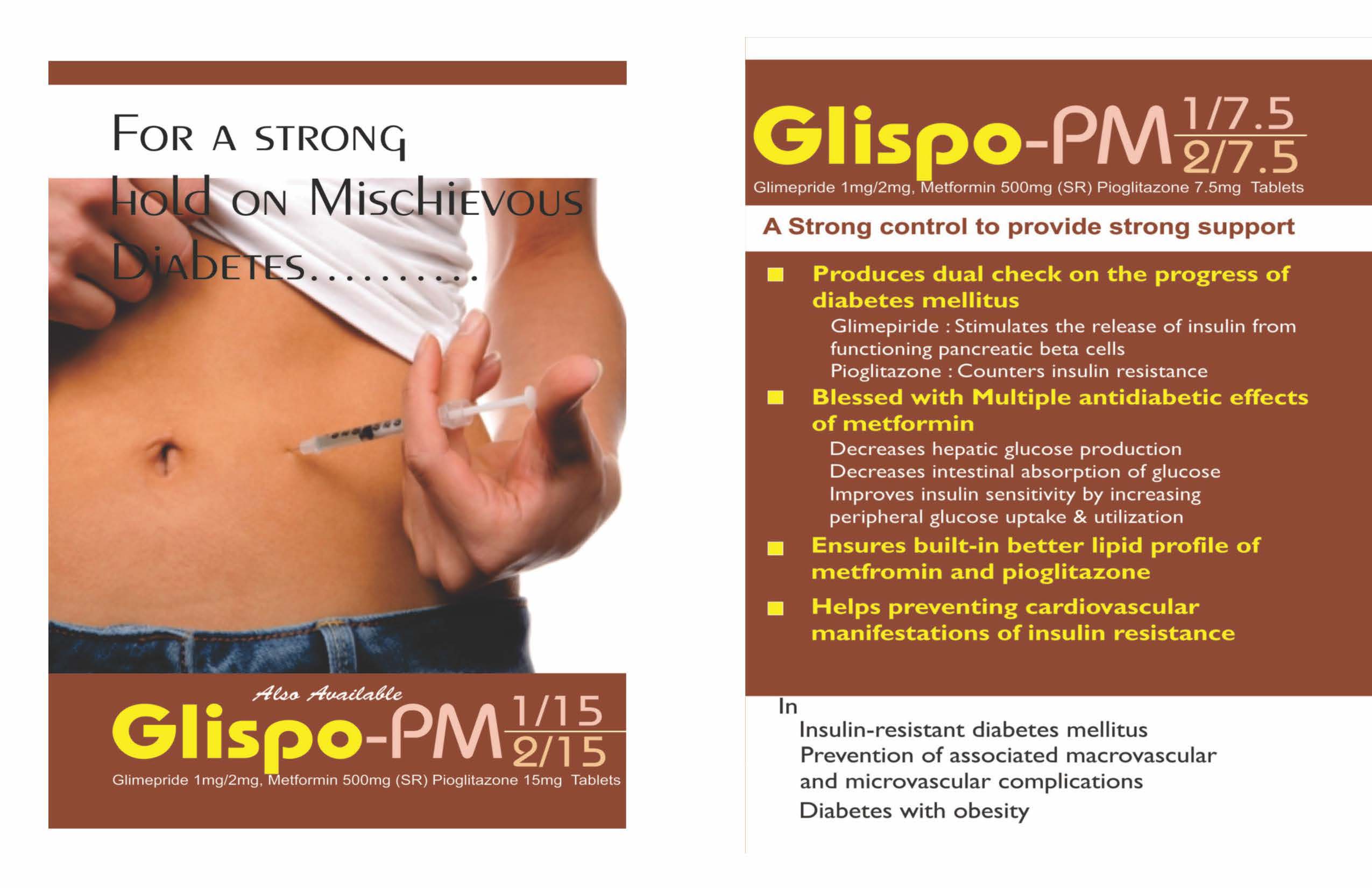 DIABETIC RANGE 7 GLISPO-PM2/15 GLISPO-PM2/15 Glimepride 2mg + Metformin 500mg (SR) + Pioglitazone 15 mg1. Stimulates the release of insulin from functioning pancreatic beta cells.2. Counters insulin resistance.3. decreases heparic glucose production alo decreases intestinal absorption of glucose. BLISTER (BI- LAYERED) Website Link Product Image Visual Image