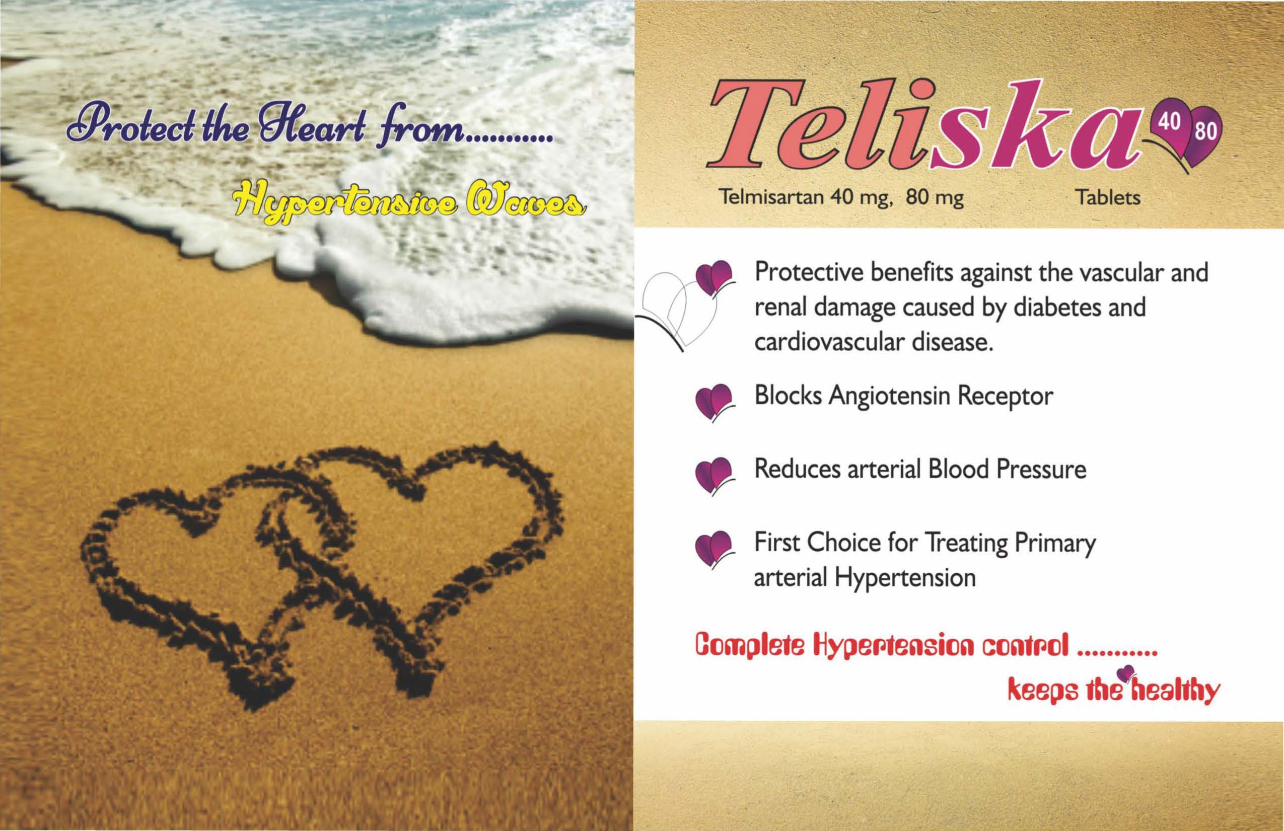 CARDIAC RANGE 6 TELISKA-40 TELISKA-40 Telmisartan HCL 40mg1. Protective benefits against the vascular and renal damage caused by diabetes and cardiovascular disease.2. Blocks angiotensin receptor. ALU-ALU Website Link Product Image Visual Image