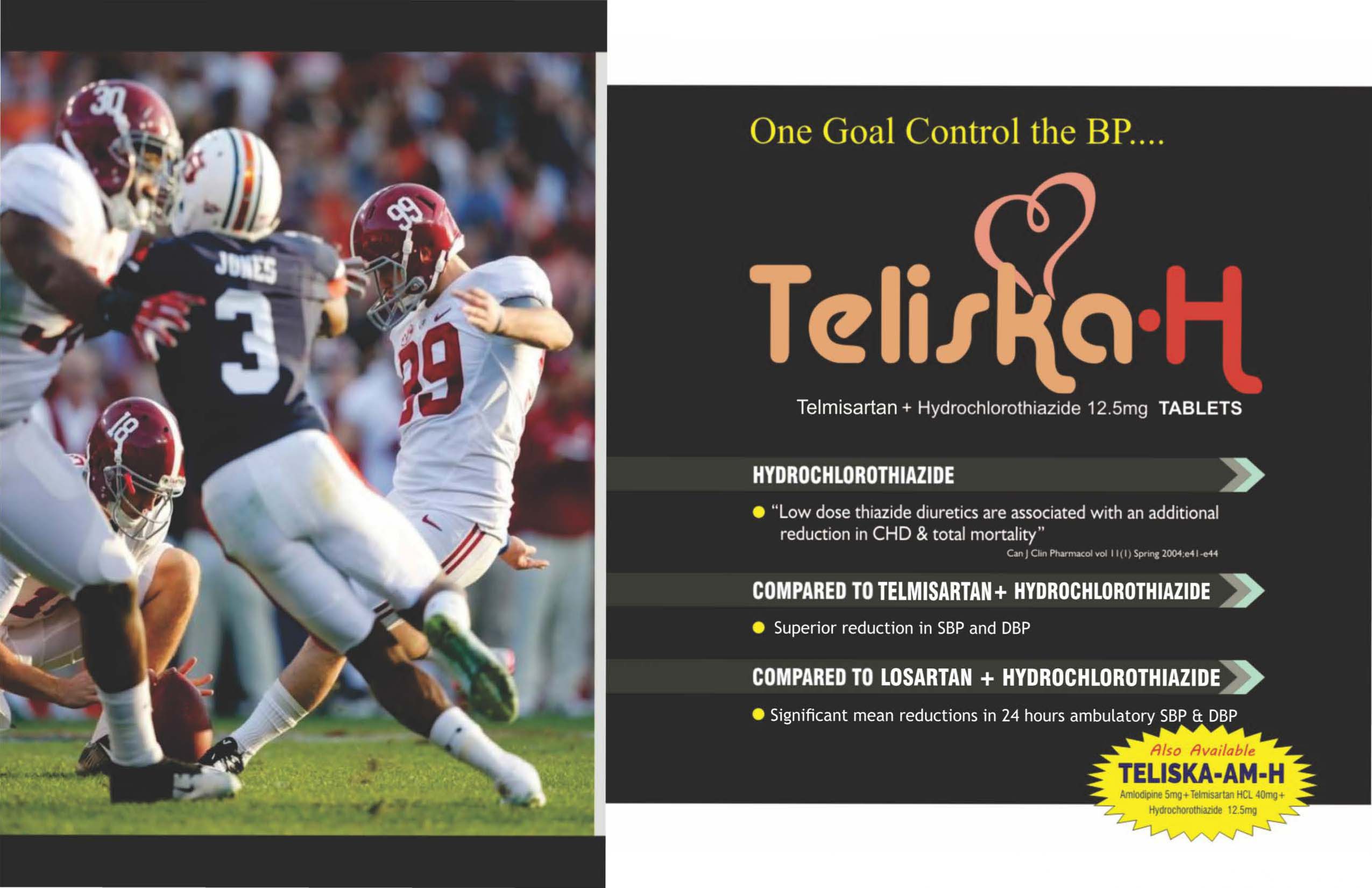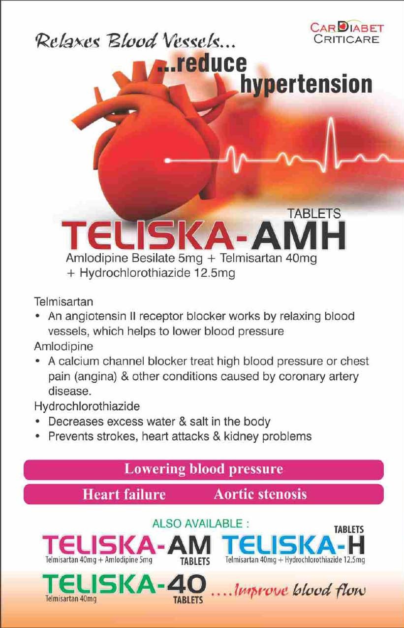 CARDIAC RANGE 3 TELISKA-AM-H TELISKA-AM-H Amlodipine 5mg + Telmisartan HCL 40mg + Hydrochorothiazide 12.5mg1. Reduces arterial blood presure.2. Low dose thiazide diuretics are associated with an additional reduction in CHD & total mortality.3. More effective than Losartan in controllin SBP.4. Offers highest PPAR Gamma activation as compared to any other ARB. BLISTER Website Link Product Image Visual Image
