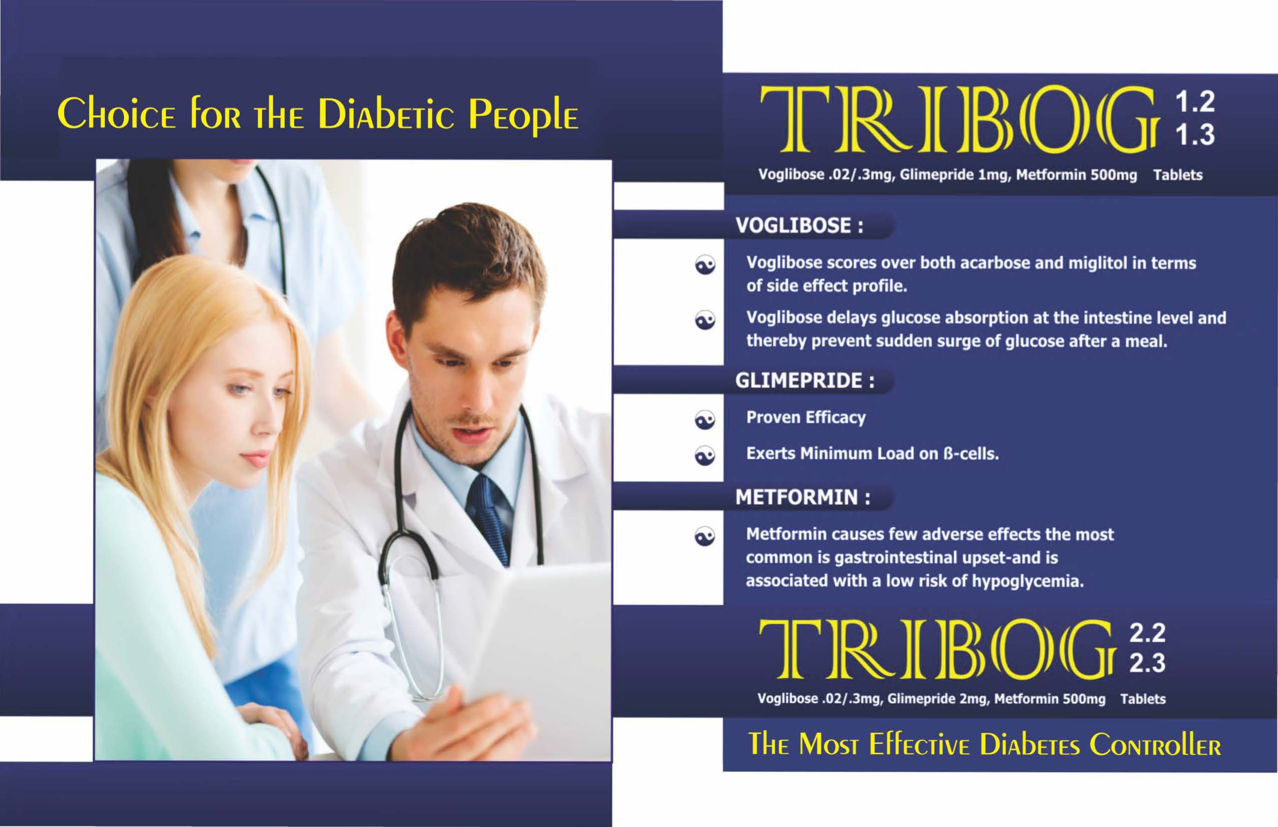 DIABETIC RANGE 6 TRIBOG-1.2 TRIBOG-1.2 Glimepride 1mg + Voglibose 0.2mg + Metformin 500mg (SR)1. Voglibose scores over both acarbose and miglitol in terms of side effct profile.2. proven efficacy.3. metformin causes few adverse effects the most common is gastrointestinal upset and is associated with a low risk of hypoglycemia. BLISTER (BI- LAYERED) Website Link Product Image Visual Image