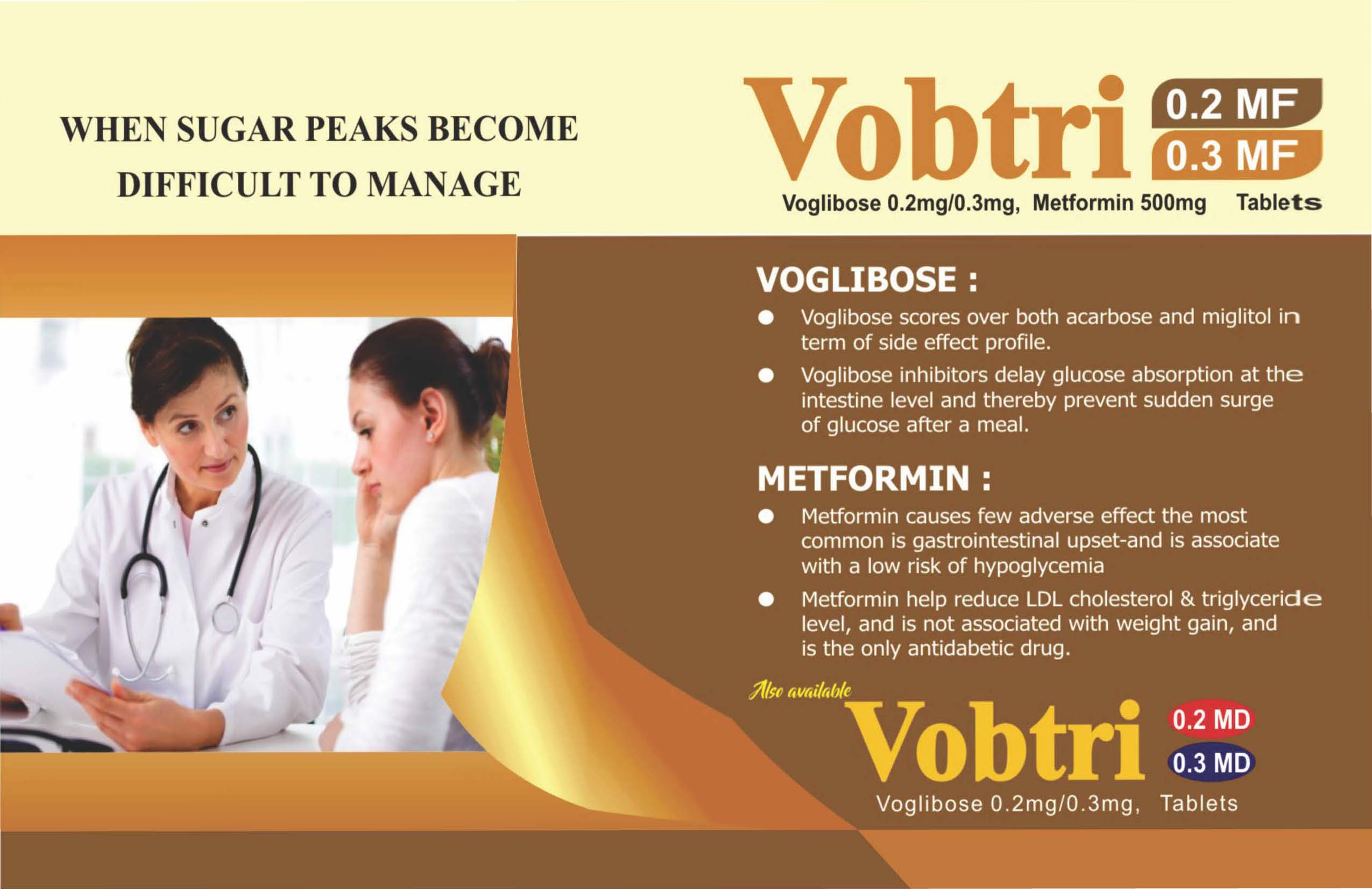 DIABETIC RANGE 1 VOBTRI-0.3MD VOBTRI-0.3MD Voglibose 0.3mg (MD)Voglibose inhibitors delay glucose absorption at theintestine level and thereby prevent sudden surge of flucose after a meal. ALU-ALU Website Link Product Image Visual Image