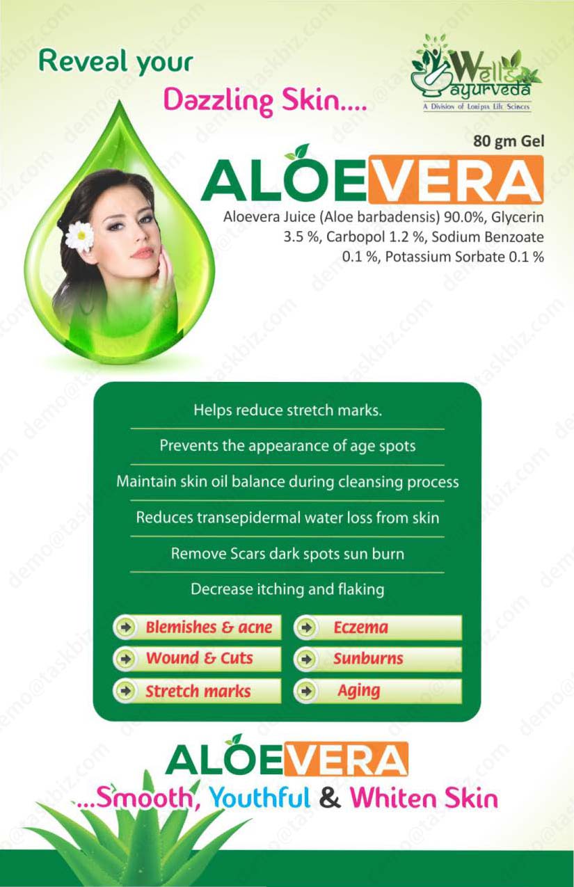 Each 100 gm Aloevera Juice (Aloe barbadensis) 90.0%,Glycerin 3.5 %, Carbopol 1.2 %, Sodium Benzoate 0.1 %,Potassium Sorbate 0.1 %, D.M. water Q.S., Colour & Fragrance