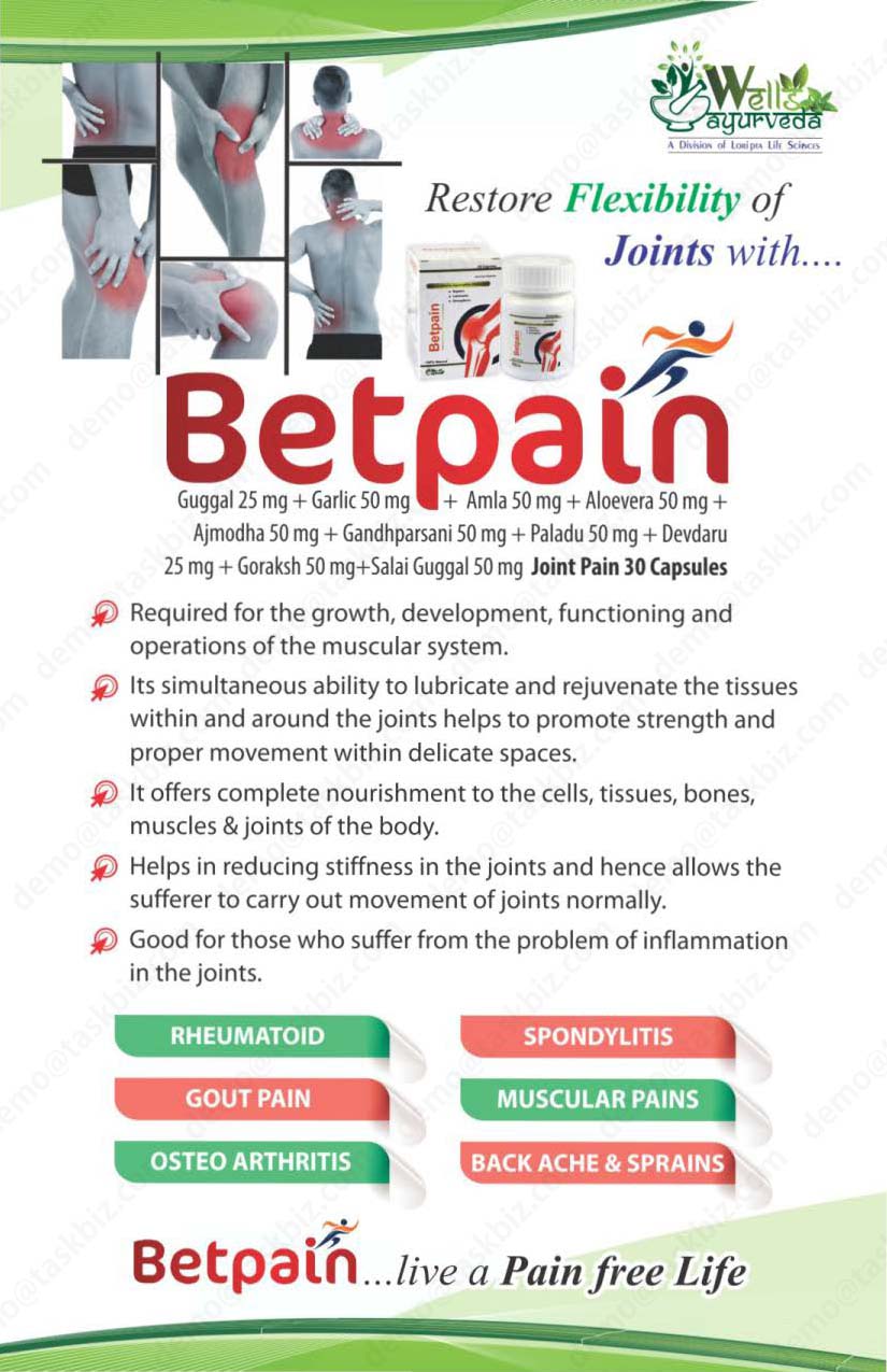 JOINT CARE CAPSULES Each capsule contains :Guggal 25 mg+Garlic 50 mg+Amla 50 mg+Aloevera 50 mg +Ajmodha 50 mg+Gandhparsani 50 mg+Paladu 50 mgDevdaru 25 mg+Goraksh 50 mg+Salai Guggal 50 mg